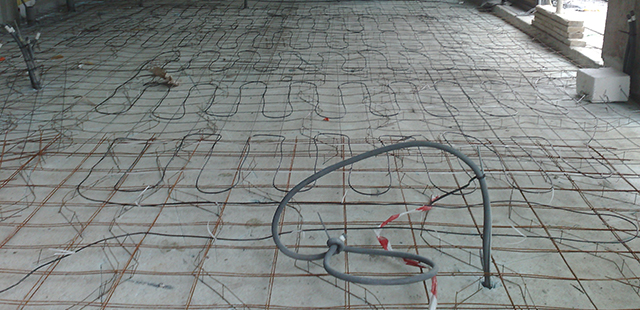 Le système du plancher chauffant électrique se compose d'un câble chauffant (résistance électrique) agrafé sur un isolant polystyrène ou polyuréthane. Ceux-ci sont noyés dans la dalle qui est ensuite chauffée par effet joule grâce à notre système. Ce procédé fonctionne par leur seul moyen d'une alimentation électrique et il est régulé par un simple thermostat.